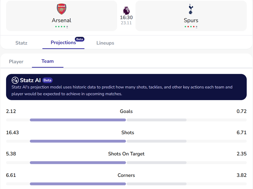 Arsenal vs Tottenham: Statz Projections