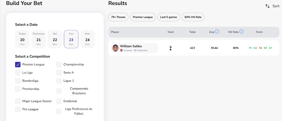 William Saliba averages 78.44 passes in his last five games, with Over 78.5 Passes – a line offered by bet365 for Sunday’s game – landing with an 80% hit rate.