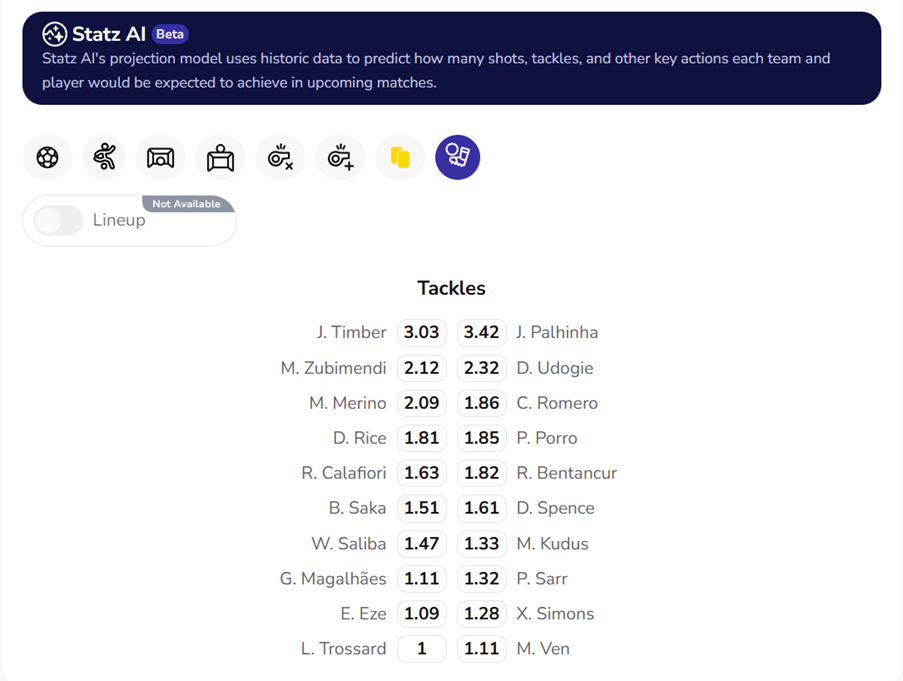 A fierce local derby wouldn’t be the same without tackles flying in, with our AI projections suggesting that Jurrien Timber, Destiny Udogie and the ever-willing Joao Palhinha are the most likely to get stuck in.