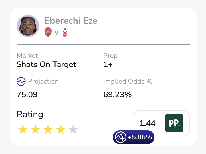 If Ange’s time at Spurs taught us anything, it’s that his teams concede (lots of) chances. Eberechi Eze should be one of the men to take advantage of this, as he looks to prove himself at his new club. Our model implies a 75% chance of 1+ Shot on Target for Eze, whilst the implied odds from Paddy Power and Ladbrokes are 69%, so the Statz model shows a 5.86% edge.