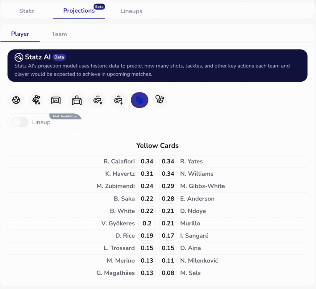 Darren England takes charges of this one and let’s look at Statz’s Projections for yellow cards in this fixture. Calafiori is projected as most likely for an Arsenal booking and at odds of 4.5 with bet365, this makes appeal. MGW is also projected quite strongly, so we’ll combine the two for a nicely priced double.