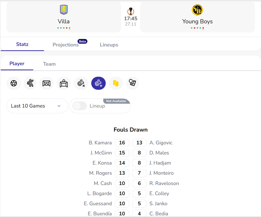 His fellow Europa League regular, Evann Guessand, could also be a live player in this market. He’s drawn ten fouls from ten games, but remember that Villa should dominate the game here and have Young Boys under the pump for much of it.