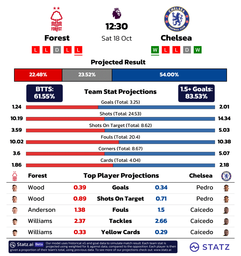 Looking at projections, Chelsea are expected to have an edge in this one, which comes as no surprise given Forest’s early season struggles . That said, the Statz Model predicts a feisty encounter with 20+ fouls and 26+ tackles projected, so expect both sides to get stuck in.
