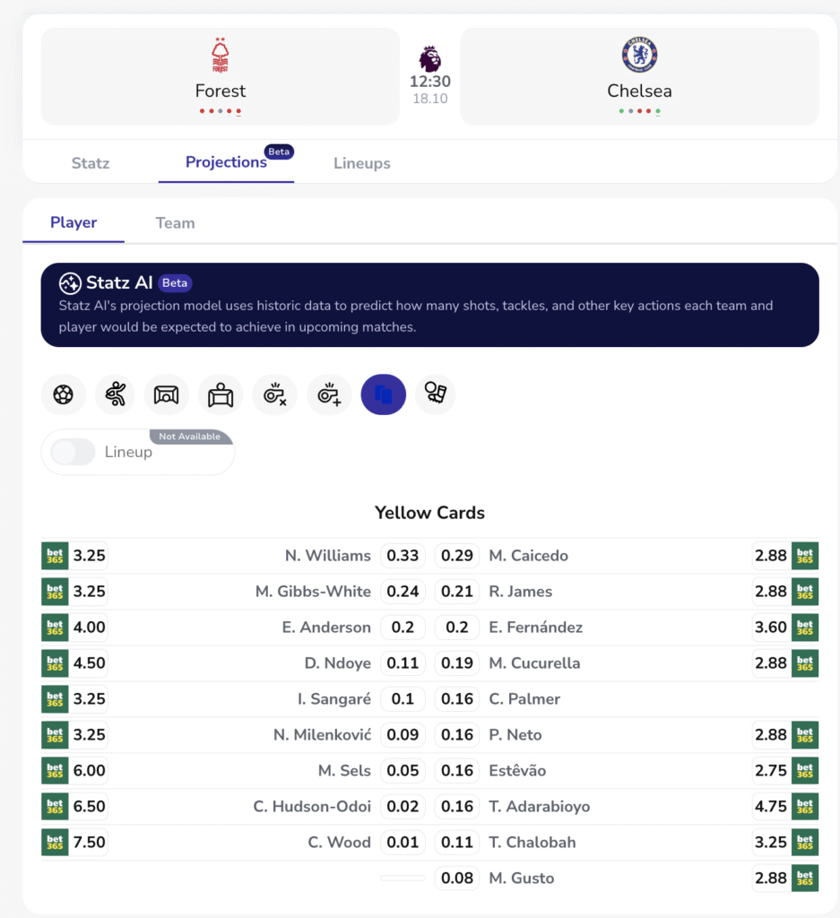 Chris Kavanagh takes charges of this one and let’s look at Statz’s Projections for yellow cards in this fixture. This should have an edge to it and we fancy regular foul merchants Williams and Anderson to go into the book here.