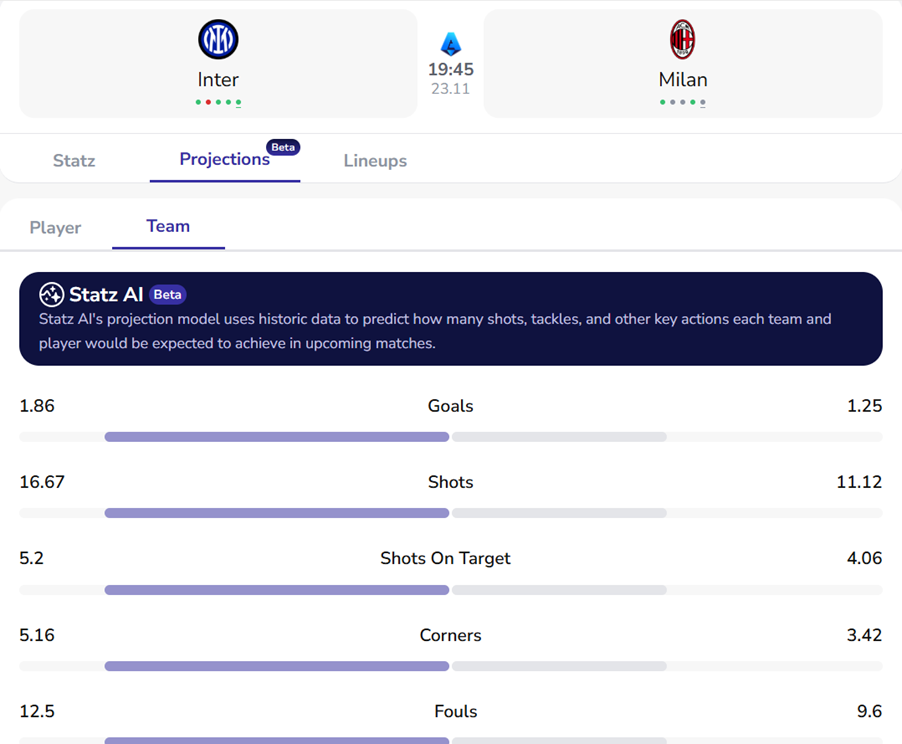 Indeed, it’s Inter that will deliver the most action-packed performance of the pair – as per our machine learning model – with the Nerazzurri expected to dominate the shot, corner, tackle and foul count.