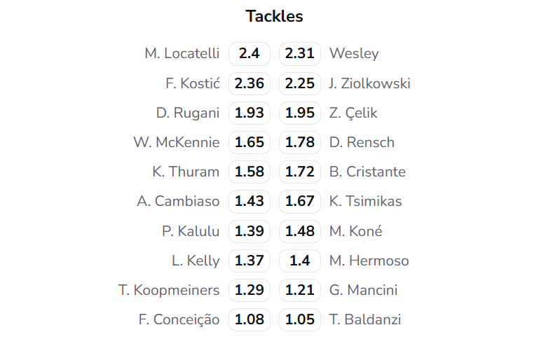As you can see, both Manuel Locatelli and that man Wesley have been modelled to make two or more tackles on Saturday.
