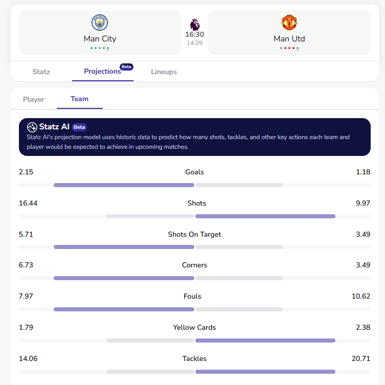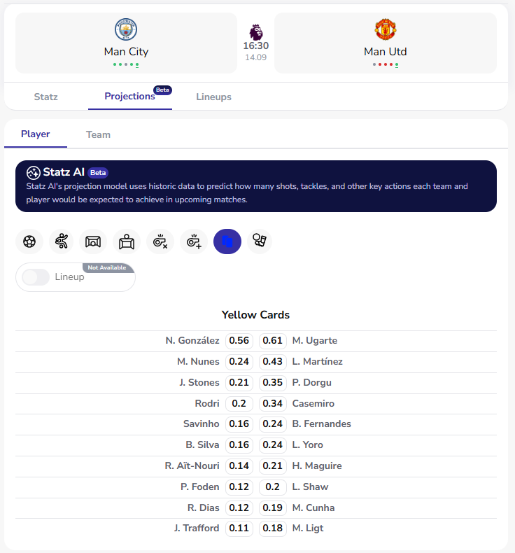 Wythenshawe born Anthony Taylor is in charge of proceedings, the card happy ref might be dishing them out if this one gets feisty. Statz’s Projections for yellow cards in this fixture, like the look of Matteus Nunes and Casemiro to get their feet dirty in this one. For our final one of our Man City vs Man Utd Betting TipDouble available @ 14-1 with B365.
