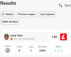 Our Bet Builder tool is also great for uncovering potential gems. Lenny Yoro showing up in our 2+ tackle search filter, having hit the mark every time in the first 3 Premier Leage games. He’s available here at 1.83 with Ladbrokes, or take advantage of Sub on Play on with Bet365 @ 1.66