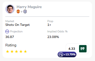 This one is subject to lineup confirmation, but if he’s in from the start, we’ve got a massive Statz Edge on a Maguire SOT. Last Season Maguire scored 3 big-game winning goals for United, and with their lack of goalscoring prowess on show again this season, set pieces are the order of the day. Our projections model puts this at a touch under 37% chance, with Paddy Power rating this around 23%, well worth an edge play.