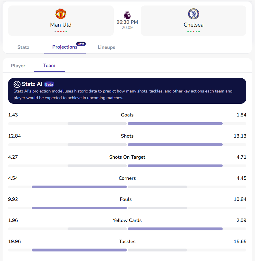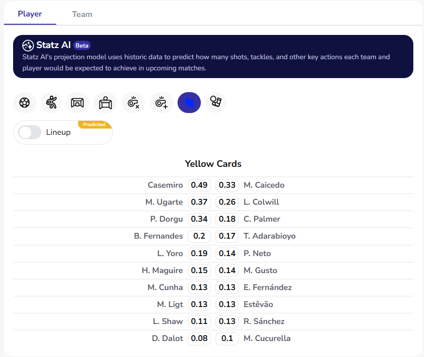 Robert Jones takes charges of this one and let’s look at Statz’s Projections for yellow cards in this fixture. Dorgu is projected 2nd most likely for Man Utd from the starters at odds of 4.33 with bet365, this looks solid. Caicedo is also projected quite strongly, so we’ll combine the two for a nicely priced double.
