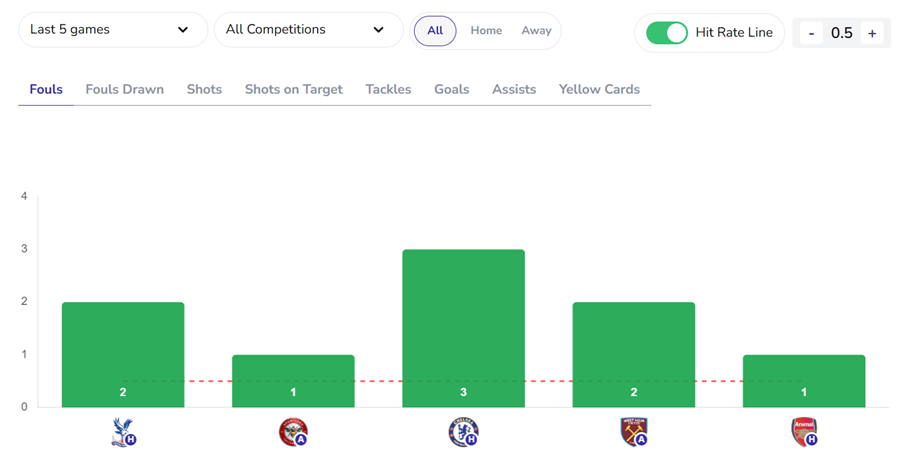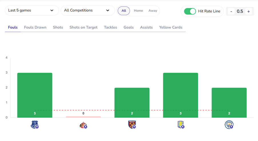 And it did: Adams committed three fouls against the Toffees, continuing a hit rate of 80% for two or more fouls per game in his last five outings.