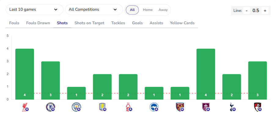 It continues a shooting formline that now reads 4-3-2-3-4 in his last five outings, so Bowen is evidently full of confidence – he ranks fourth in the Premier League this term for shots taken.