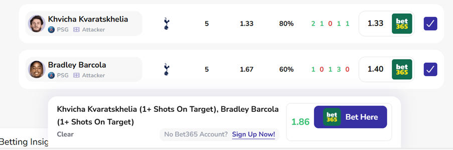 It’s a bet that would have landed in 80% of Kvaratskhelia’s last five starts and 60% of Barcola’s. And you can back it with a single click at bet365 below: