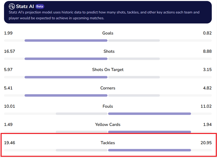 We’re expecting PSG to win the shot count at around 16-8, which suggests that they will dominate proceedings, while our projection for a mammoth amount of tackles will lead our betting picks for this fixture.